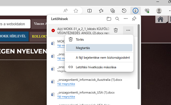 A "letöltések" ikonra kattintva a piros X-es sorok jobb oldalán látható menüben (3 db pont-ra kattintva) a "Megtartás"-t választva megnyitható a letöltött fájl.